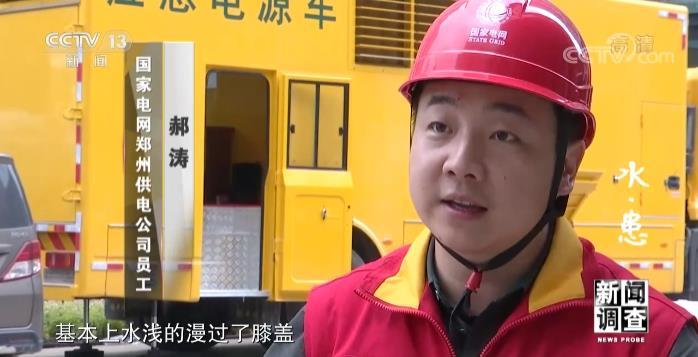 国家电网郑州供电公司 员工 郝涛:我们是蹚着1米4到1米5的水深,基本上水浅的漫过了膝盖,深的就到了胸口,我们6个人基本上就是前后挨着,拿棍子在探着路,一点一点走了几十分钟。看了以后,我心里的第一反应是,这个路我们的(发电)车根本过不来。路上漂浮的各种车辆,电动车、汽车、各种杂物,将整个路基本上都给堆的,连人过去都得小心翼翼的,更别说咱们将近3米宽,12米长,将近4米高的一个大型装备车辆到达现场。