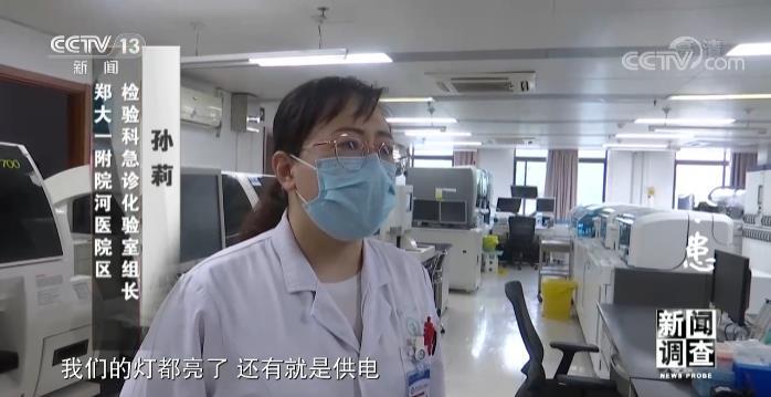 郑大一附院河医院区检验科急诊化验室 组长 孙莉:现在就照明电你也看到了,我们的灯都亮了,另外还有就是供电,其中我们自己发的电也有,但是必须有市电,才能把我们的机器带起来,要不然功率不够。