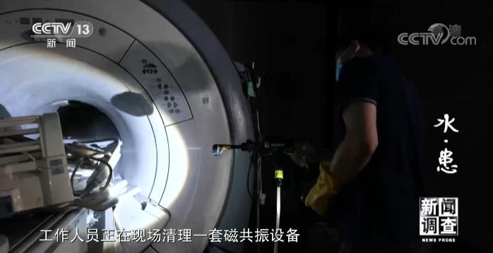 门诊楼地下一层有磁共振科、放射科、放疗科三个科室,多种大型设备都集中于此,由于长时间被水浸泡,设备损坏严重。工作人员正在现场清理一套磁共振设备。