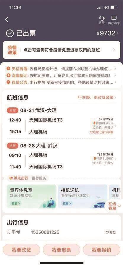 武汉市民徐先生向极目新闻反映,7月中旬,他们一家五口计划到云南旅游,购买了5张武汉往返大理的机票,由云南祥鹏航空执飞,总共花费9732元。7月30日,武汉市疾控中心发出紧急提醒:非必要不出境,暂缓出省旅游。为响应号召,徐先生一家决定取消云南之旅。