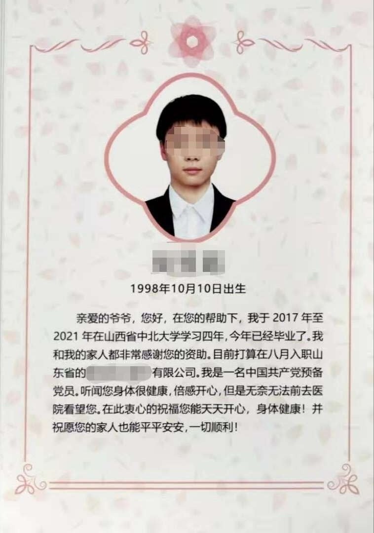 杨煜桐是吉县吉昌镇人,2013年,其父亲因病去世,他与母亲相依为命。2017年,他从临汾七中毕业,考入中北大学。刚开始时,他对袁星光爷爷要资助他一事,“将信将疑”。几天后,袁星光爷爷帮他把“读大学四年所需学费与住宿费共23200元钱”付清了。他上大学期间,学习认真,积极上进,于2020年入党。今年毕业后,他被山东一家大型国企录用。