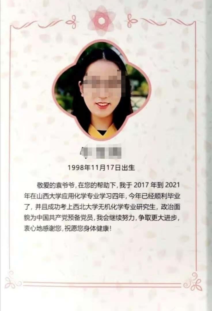 任书瑶说,她把袁星光爷爷写给她的这封电子版资助信,一直保存在手机里:“每当我学习状态不佳,偶尔想贪玩的时候,我就会看看它。袁星光爷爷在信中所说的话,一直激励着我追求更大的进步。现在我已考上西北大学的研究生。我会继续刻苦学习,不负袁星光爷爷的期待,争取以优异成绩完成学业,报效国家和人民。”