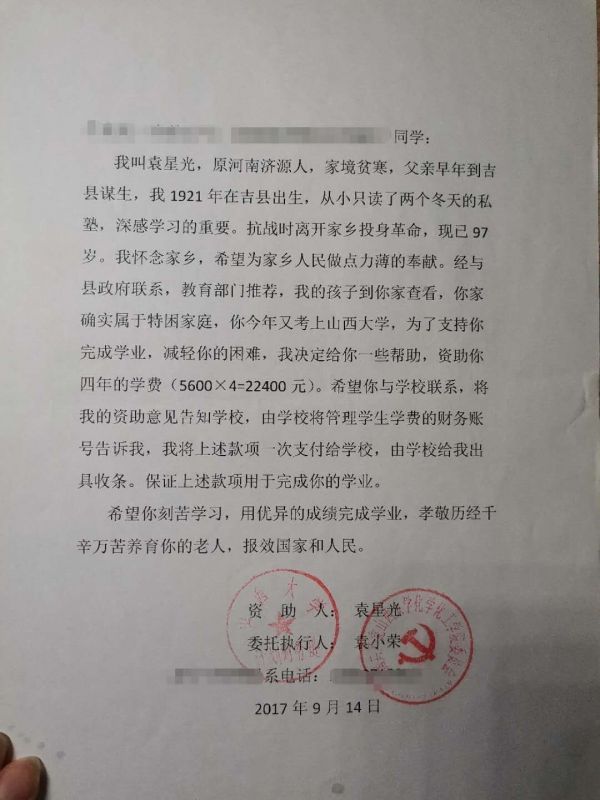 “任书瑶同学,我叫袁星光,原河南济源人,家境贫寒,父亲早年到吉县谋生,我1921年在吉县出生,从小只读了两个冬天的私塾,深感学习的重要。抗战时,我离开家乡投身革命,现已97岁。我怀念家乡,希望为家乡人民做点力薄的奉献。经与县政府联系,教育部门推荐,我的孩子到你家查看,(核实)你家确实属于特困家庭,你今年又考上山西大学,为了支持你完成学业,减轻你的困难,我决定给你一些帮助,资助你四年的学费与(住宿费)(5600元X4=22400元)。希望你与学校联系,将我的资助意见告知学校,由学校将管理学生学费的财务账号告诉我,我将上述款项一次支付给学校,由学校给我出具收条。保证上述款项用于完成你的学业。希望你刻苦学习,用优异的成绩完成学业,孝敬历经千辛万苦养育你的老人,报效国家和人民。”