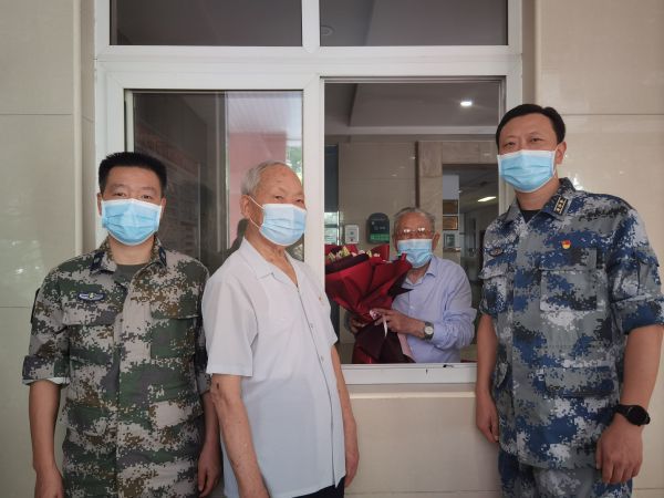 干休所工作人员隔着玻璃窗给袁星光老人祝寿。通讯员吴菡摄