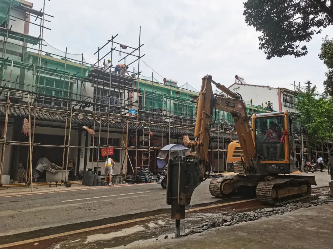 近期,安陆市烟店镇政府大门外的街道上脚手架林立,沿街门面外立面改造正酣。透过行道树的绿荫望去,已完成改造的门面“气质”拉满:一溜儿的古风门廊,棕红的圆形立柱撑起翘角飞檐,复古窗棂映衬黛瓦白墙,黄底红边的仿古旗帜在房梁下迎风飘舞,依稀可见“烟雨唐风,太白仙踪”几个字。