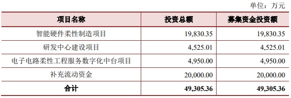 金百泽此前披露的招股书显示,公司原拟募资4.93亿元,拟分别用于“智能硬件柔性制造项目”、“研发中心建设项目”、“电子电路柔性工程服务数字化中台项目”、“补充流动资金”。