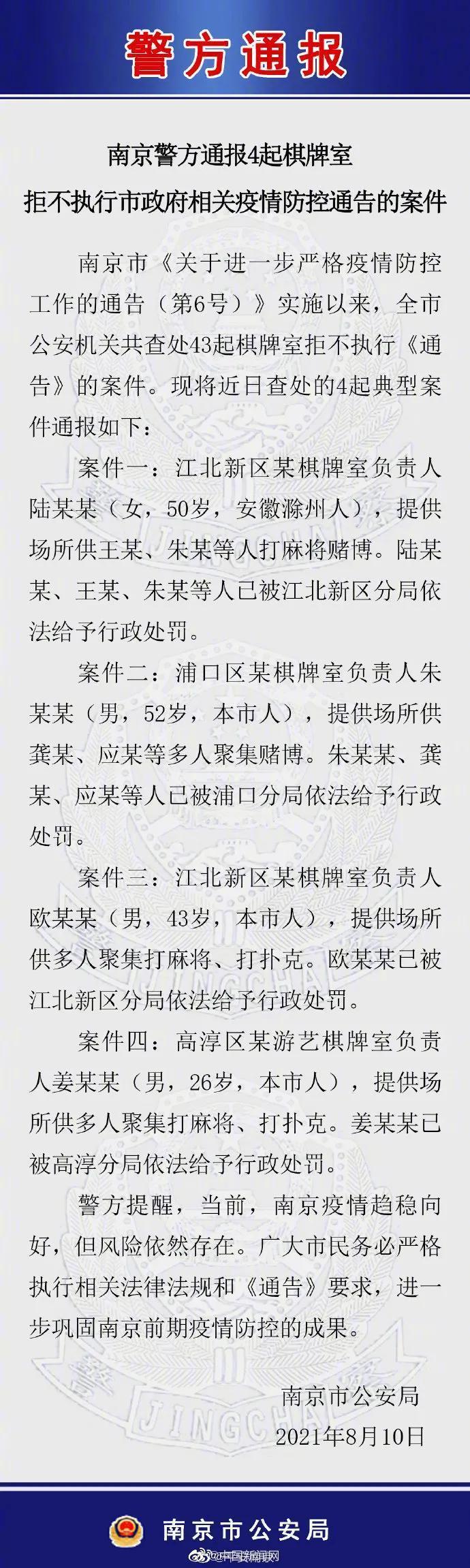 无独有偶,10日,南京4家棋牌室因给他人提供聚众打麻将、打扑克等场所被警方通报,相关场所负责人均已受到行政处罚。