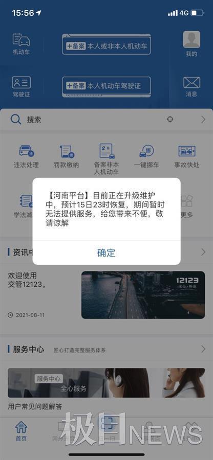 一位大学刚刚毕业的女生告诉极目新闻记者,河南“交管12123”平台从7月21日无法正常使用,一直到8月11日都没有恢复。“我是在鹤壁上的大学,驾照没考完,毕业后还特意租了房子,准备把驾照考完了离开。”该学生称,8月11日她打开“交管12123”APP,页面提示河南平台目前正在升级维护中,预计15日23时恢复,期间暂时无法提供服务。