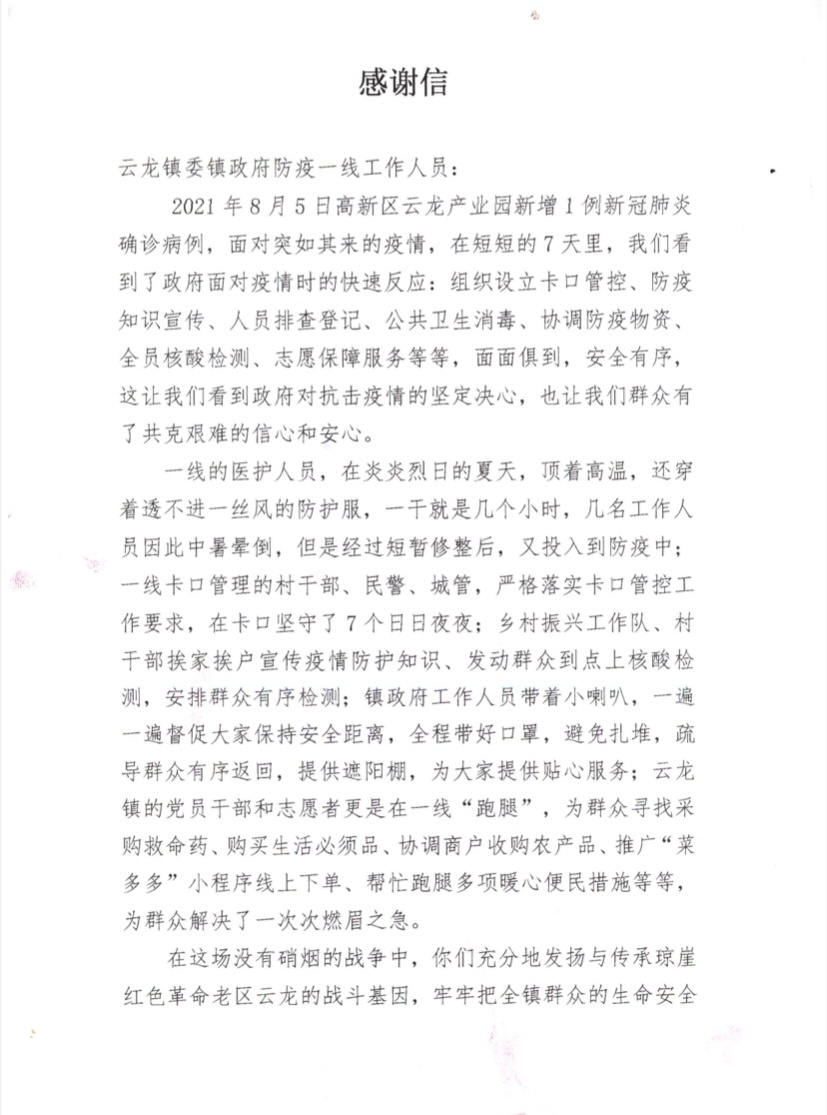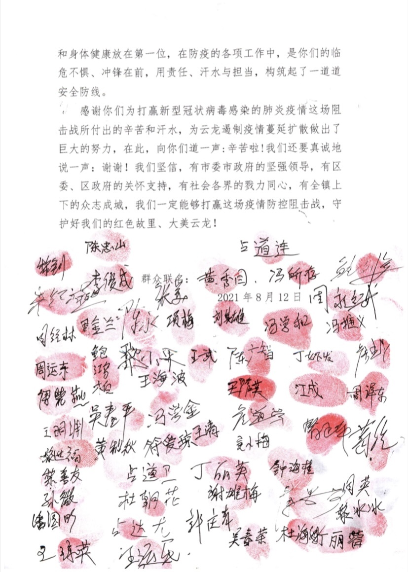 8月13日,记者在采访时看到了这封信。信上的抬头写着“感谢云龙镇委镇政府防疫一线工作人员”,信中写着:“一线的医护人员,在炎炎烈日的夏天,顶着高温,还穿着透不进一丝风的防护服,一干就是几个小时,几名工作人员因此中暑晕倒,但是经过短暂修整后,又投入到防疫中。 一线卡口管理的村干部、民警、城管,严格落实卡口管控工作要求,在卡口坚守了7个曰日夜夜。乡村振兴工作队、村干部挨家挨户宣传疫情防护知识、发动群众到点上核酸检测,安排群众有序检测。镇政府工作人员带着小喇叭一遍一遍督促大家保持安全距离,全程戴好口罩,避免扎堆,疏导群众有序返回,提供遮阳棚,为大家提供贴心服务。云龙镇的党员干部和志愿者更是在一线‘跑腿’,为群众寻找采 购救命药、购买生活必需品、协调商户收购农产品、利用小程序线上下单、帮忙跑腿多项暖心便民措施等等, 为群众解决了一次次燃眉之急……”信的结尾写着58位居民的亲笔签名。