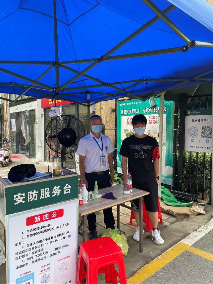 方玄烨(右一)在社区门口志愿服务。 通讯员彭伟 摄