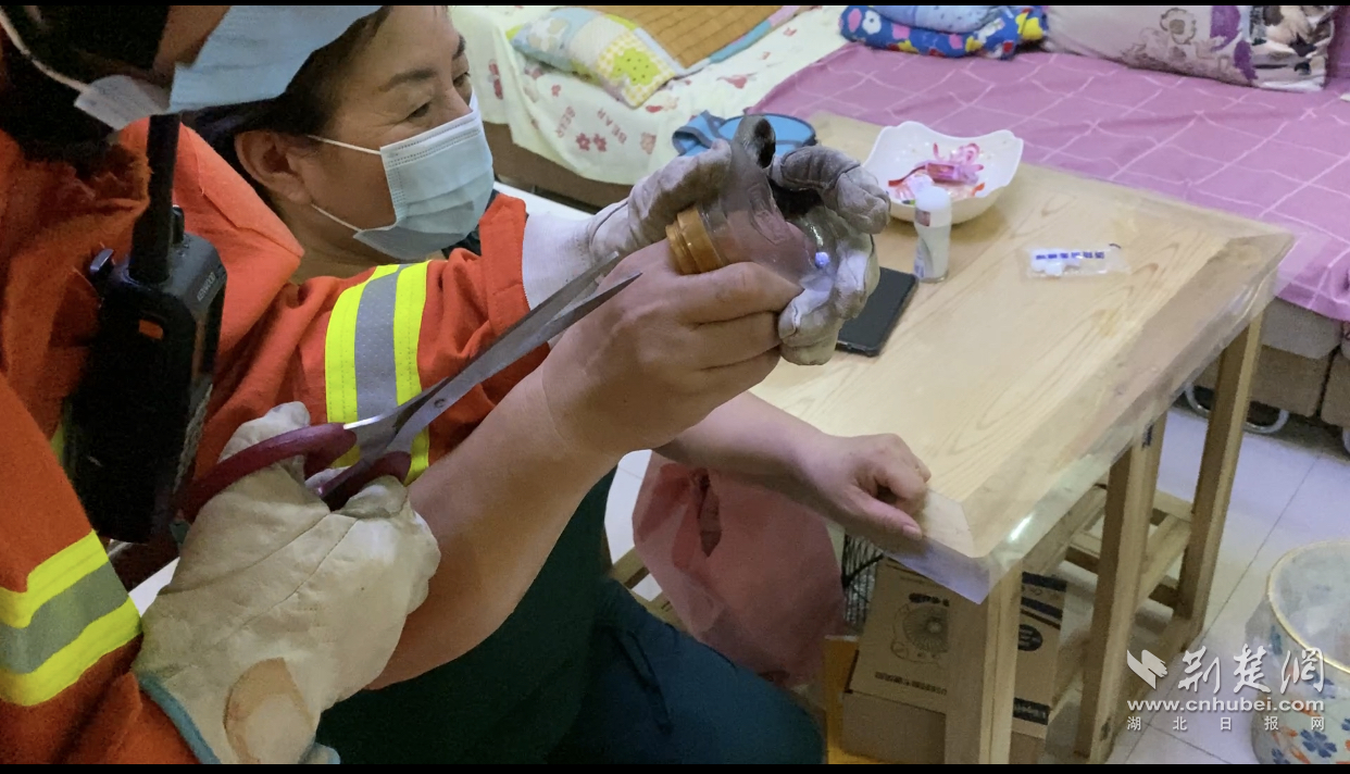 荆楚网(湖北日报网)讯(通讯员 朱燕林 甘甜)8月16日20时44分,咸宁市消防救援支队赤壁大队指挥中心接到报警称:赤壁市鹏城美丽家苑6栋1单元401有人手卡油壶,接警后,赤壁市消防救援大队金鸡山路执勤点立即出动1辆消防车、5名消防员赶赴现场。