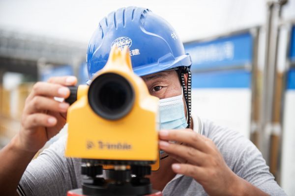 8月17日,武汉地铁复兴路站三期11号线车站,施工人员正在进行测量放线。记者任勇 摄