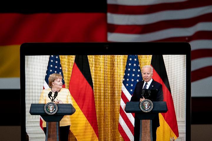 7月15日拍摄的直播画面显示,美国总统拜登(右)与到访的德国总理默克尔在美国华盛顿白宫举行联合记者会。(新华社记者刘杰摄)