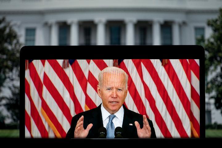 8月16日拍摄的电子屏幕显示,美国总统拜登在华盛顿白宫就阿富汗局势发表讲话。(新华社记者刘杰摄)