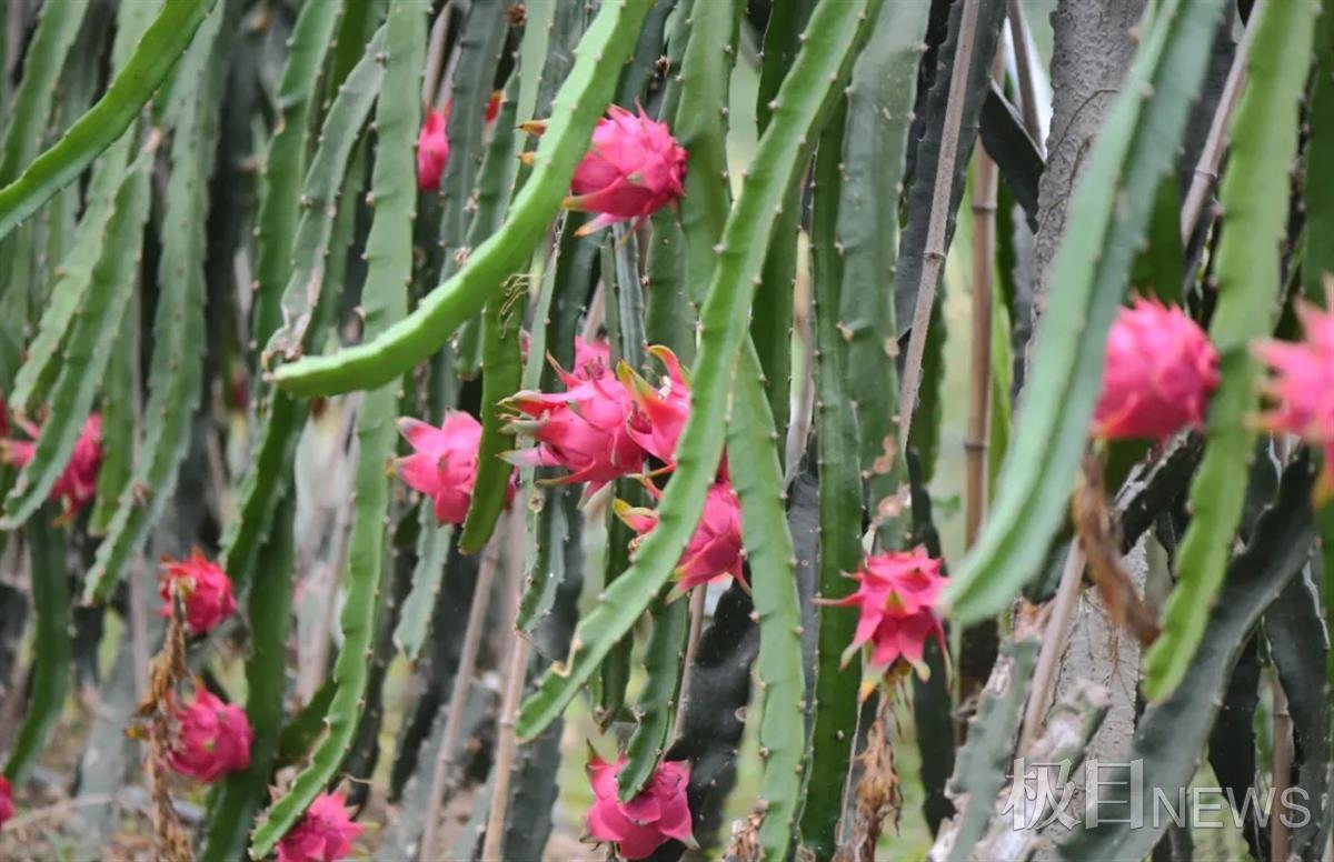 17日,极目新闻记者走进襄阳保康县唯一火龙果采摘园。果园位于保康县寺坪镇蒋口村,远远看到成片的火龙果树排列得整齐划一,厚肥翠绿的枝叶上缀满了火红鲜艳的红心火龙果,如一颗颗“红宝石”,惹人喜爱。