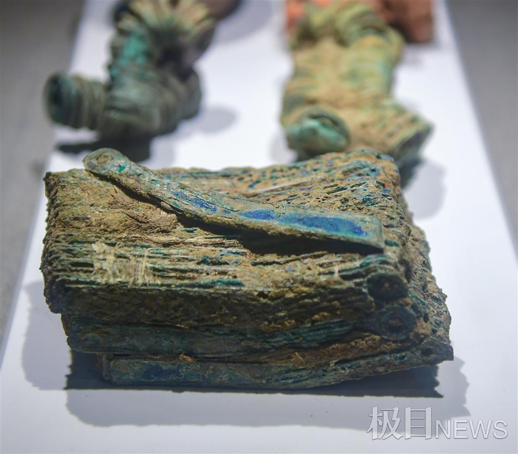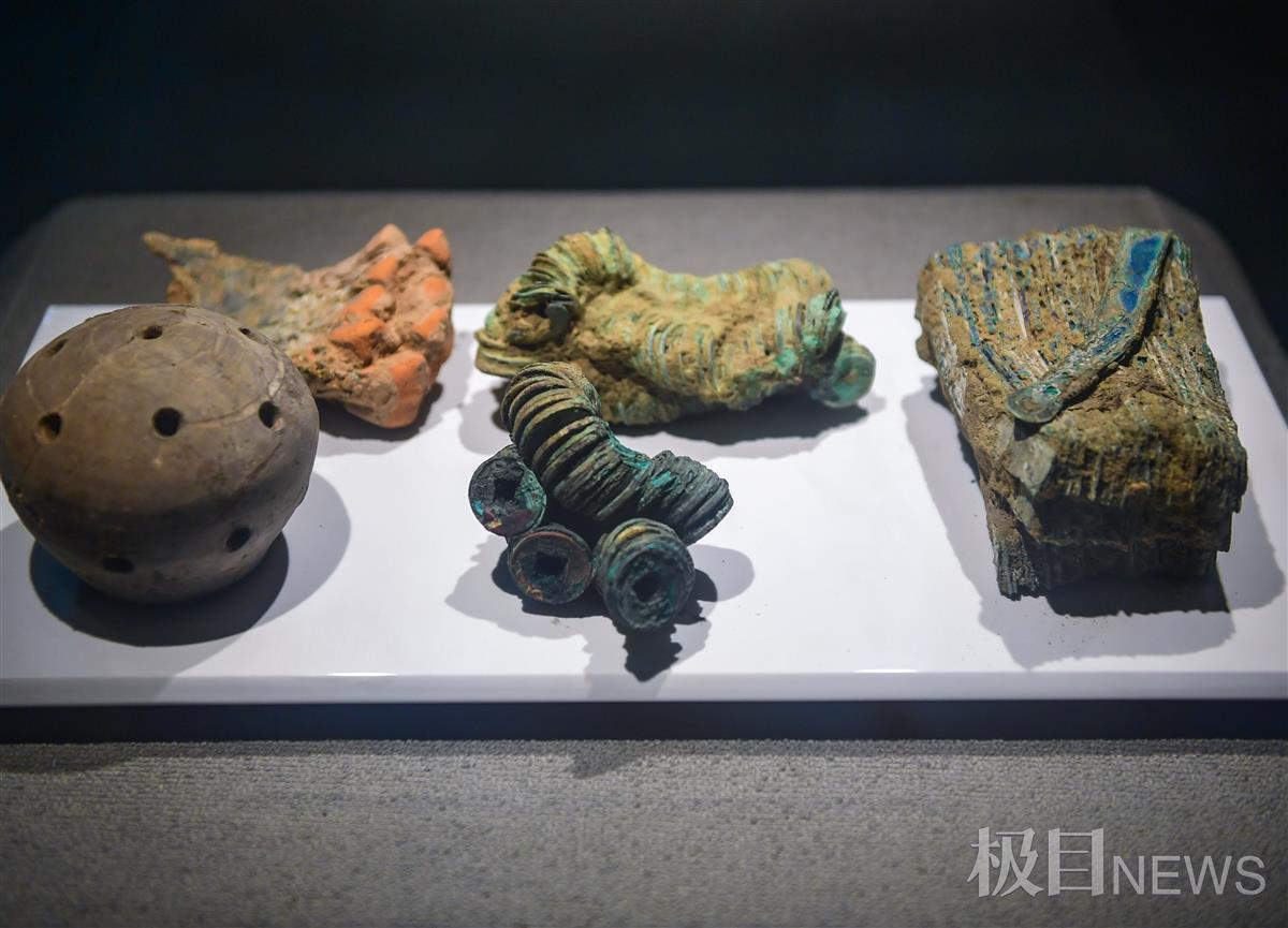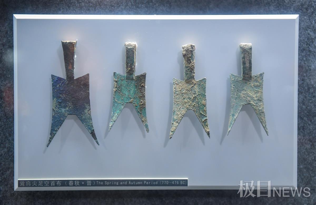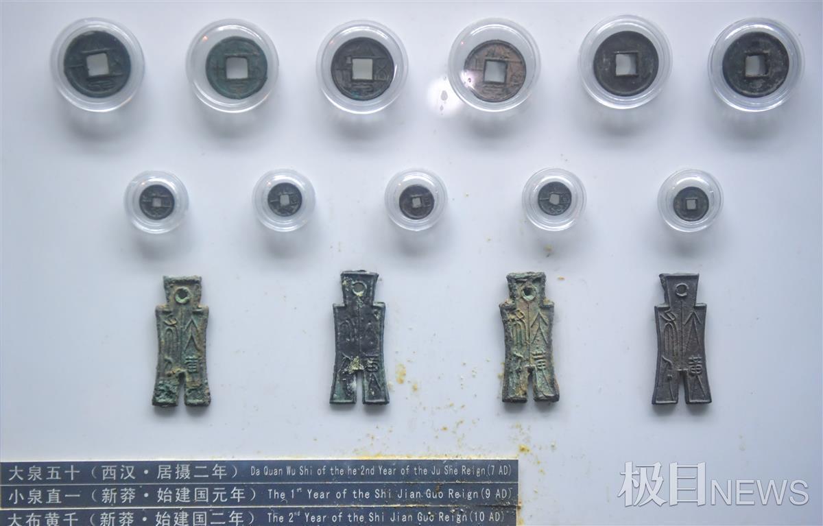 记者在展厅一处起眼的位置看到,玻璃罩内有4小堆古代钱币,一堆刀币、一堆布币、两堆五铢钱。由于年代久远,这些古钱币已与泥土融合在一起,但钱币的形状、颜色,以及钱币上的花纹与文字还清晰可见,令人叹为观止。