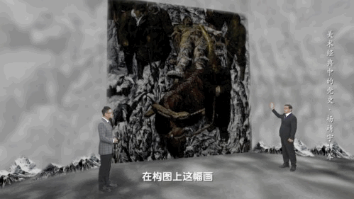 画面前景的农民手牵黄牛,在雪地中艰难前行,他的眼中充满着对烈士杨靖宇的悲悯,双手似是在为英雄虔诚祈祷。