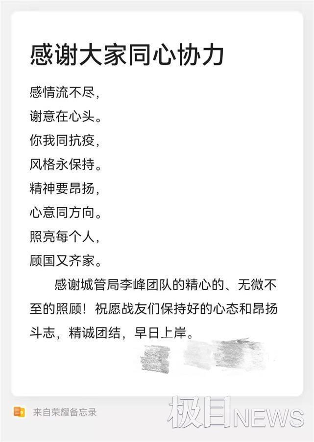 “感情流不尽,谢意在心头。你我同抗疫,风格永保持。精神要昂扬,心意同方向。照亮每个人,顾国又齐家。”17日,这是刚刚从隔离酒店离开的杨先生送给武昌城管负责值守服务团队的打油诗,虽然词藻并不华丽,但短短几行字里却透露着真诚的感激和无比的坚定。