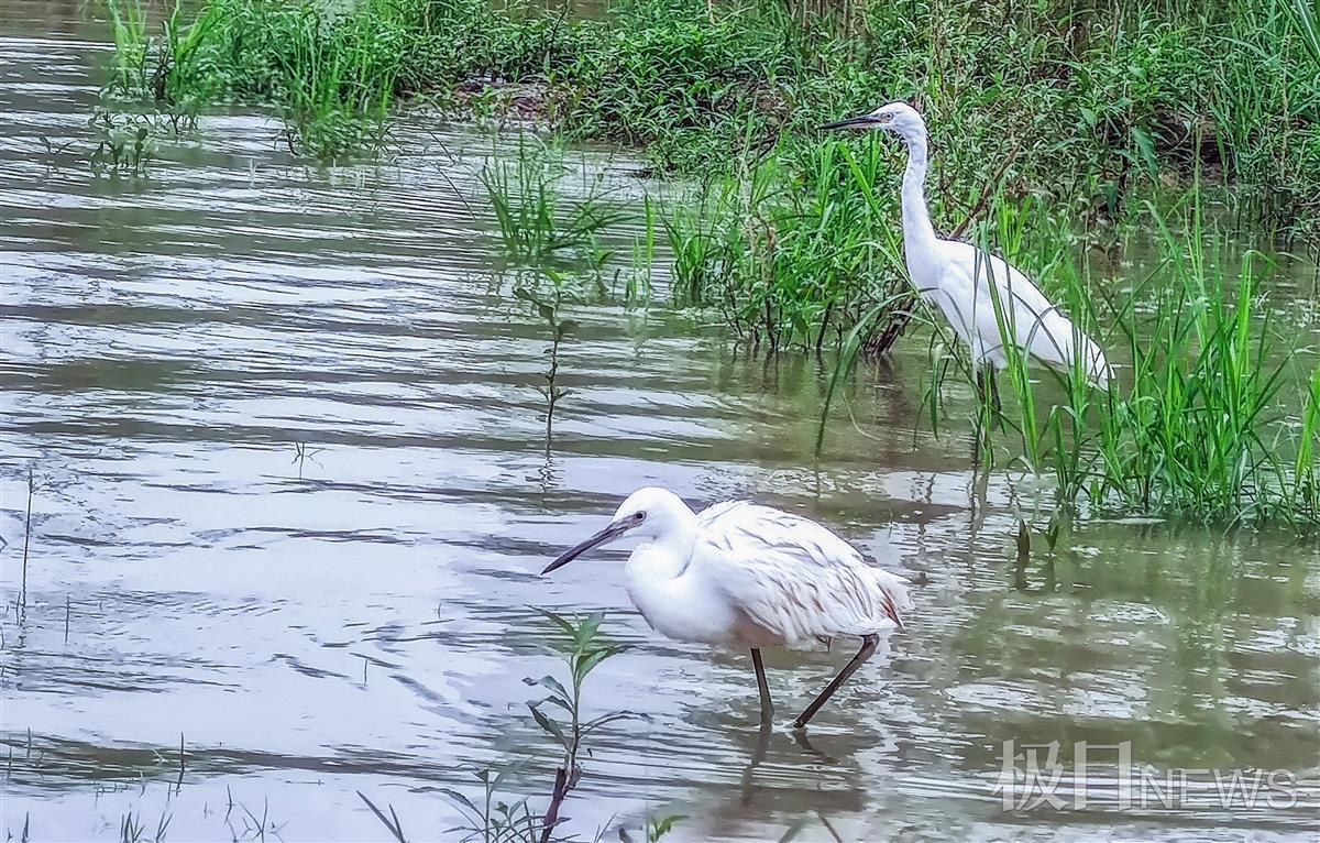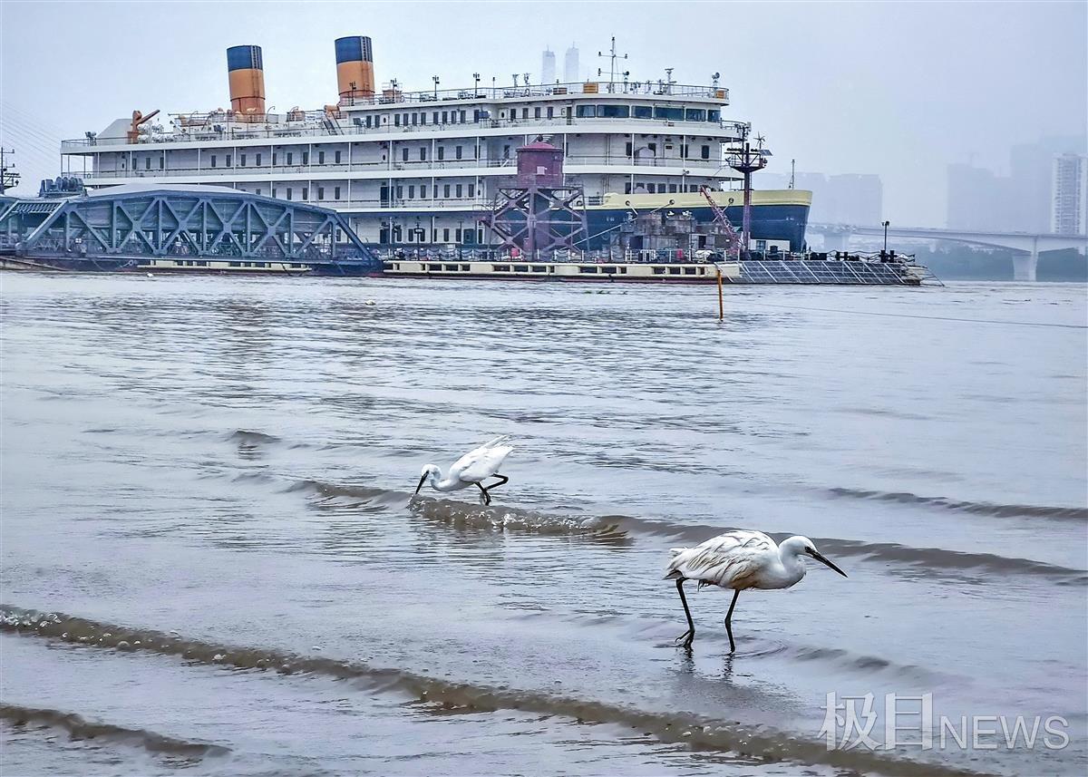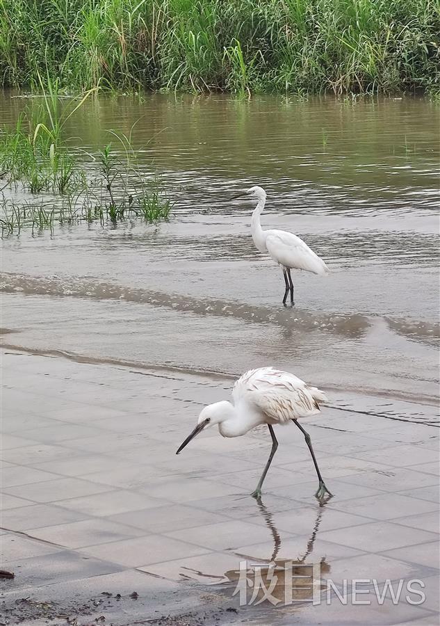 8月17日上午,在武汉汉口江滩公园健身的人发现,上涨了的江水漫上的三阳路最低层的亲水平台上,有几只白鹭戏水,时而在草上漫舞,时而站在水中的平台上捕鱼、觅食。