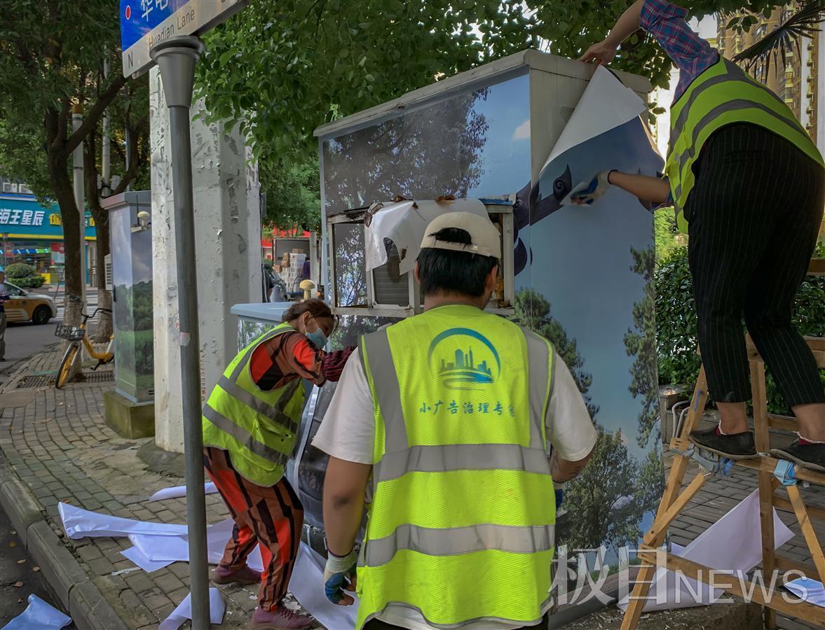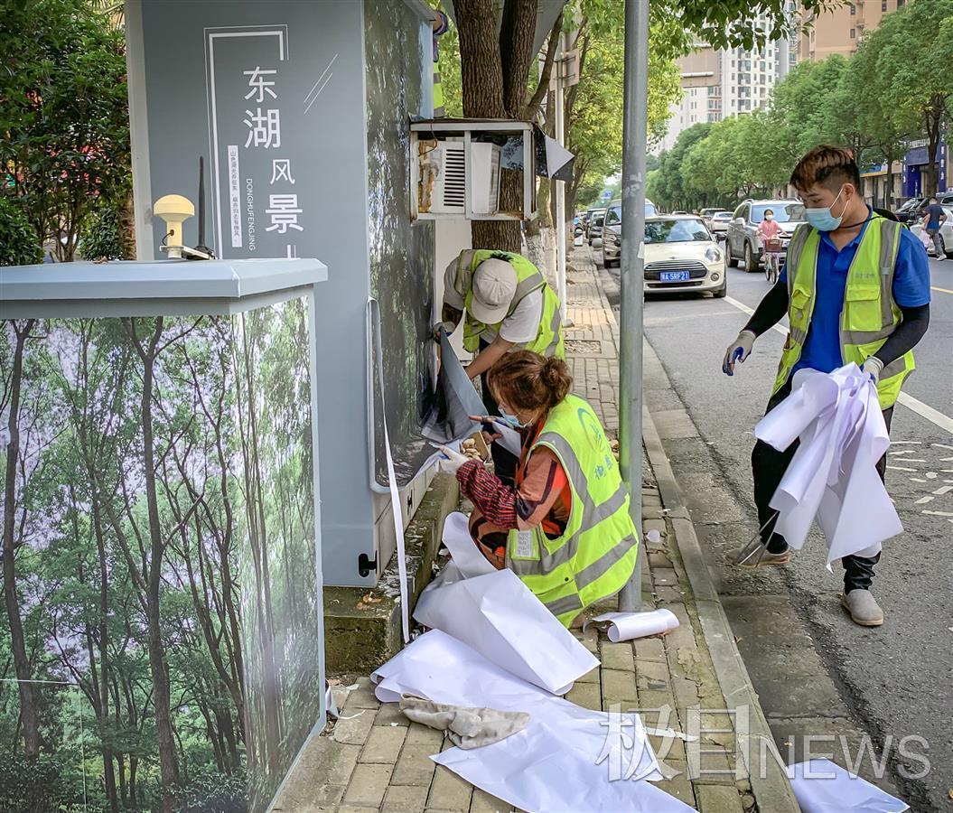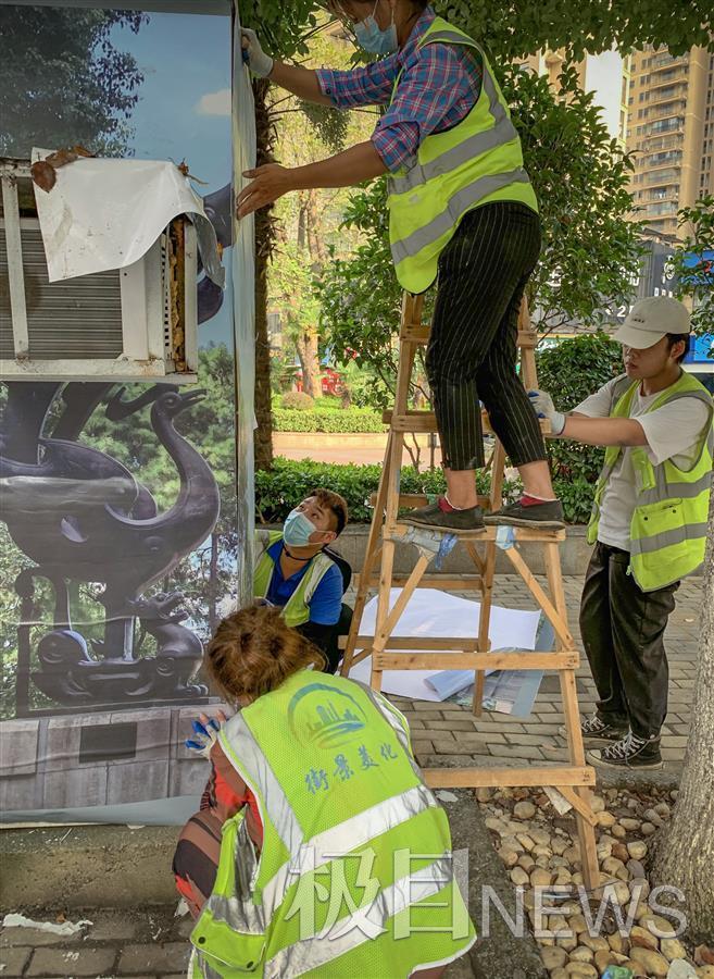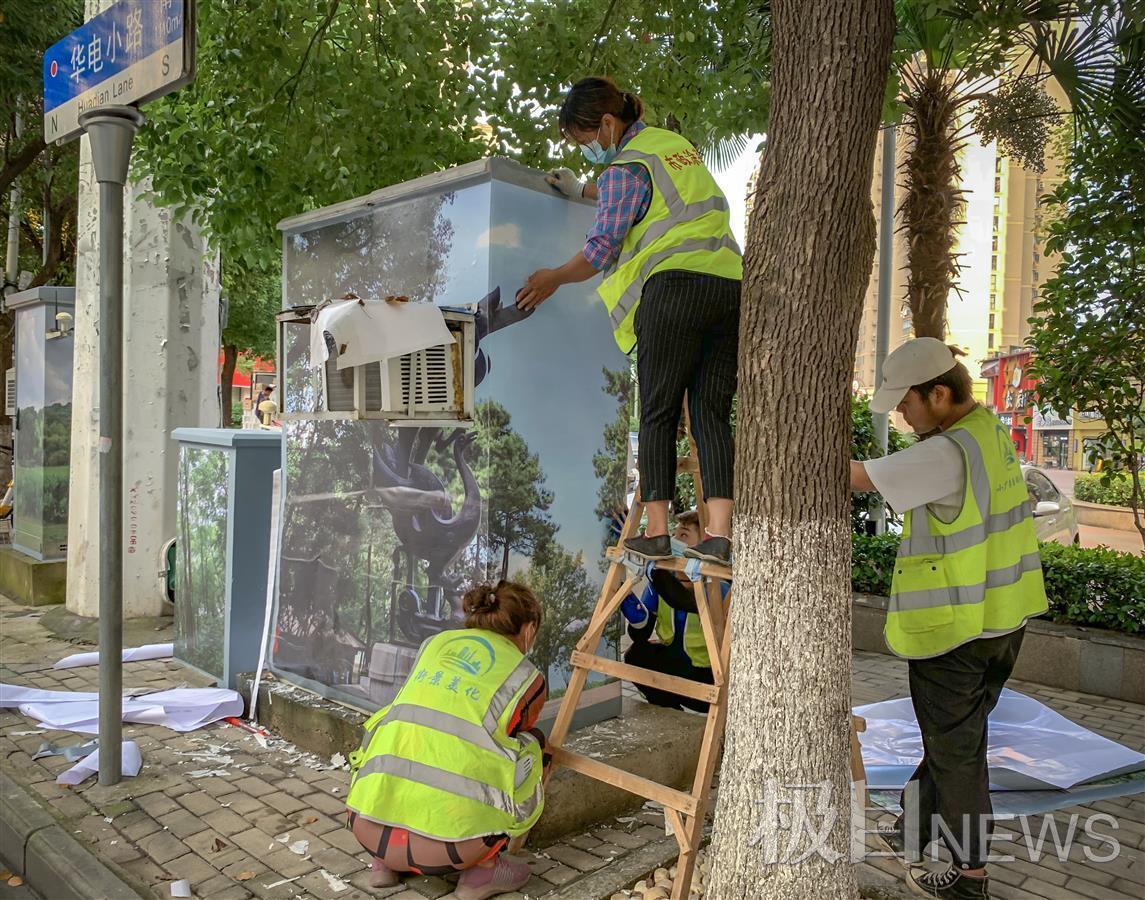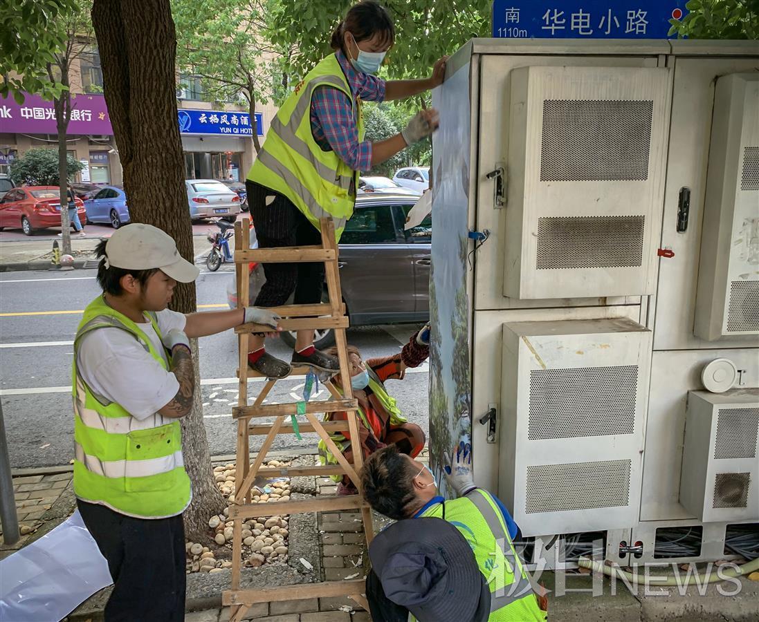 8月17日下午,多名工作人员在武昌华电小路的的配电箱旁边,用特殊材料的贴画,将配电箱进行美化。