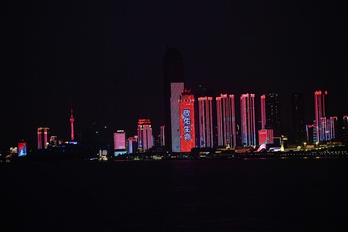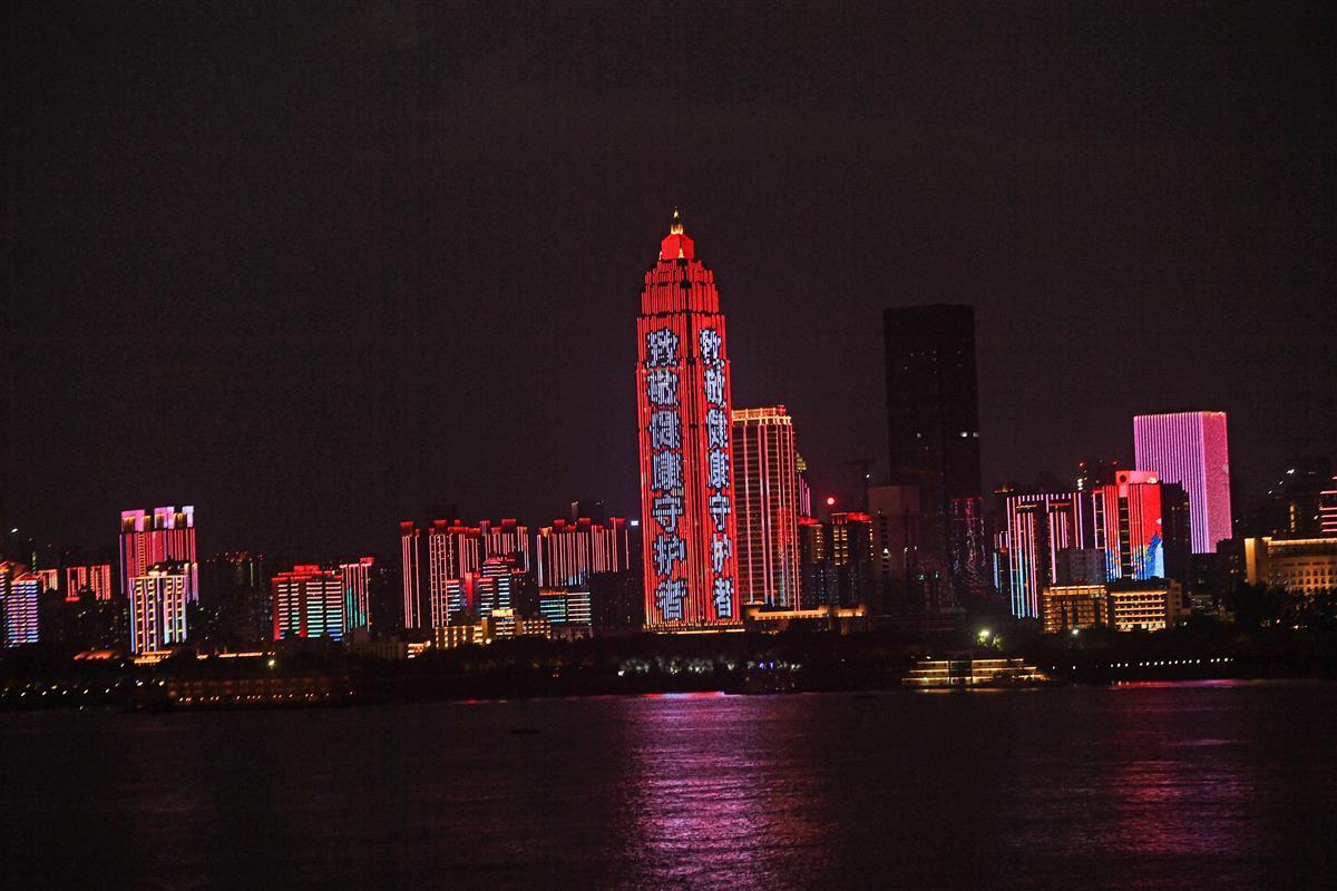 8月17日晚上8时,极目新闻记者看到,两江四岸长江灯光秀开启,庆祝医师节。