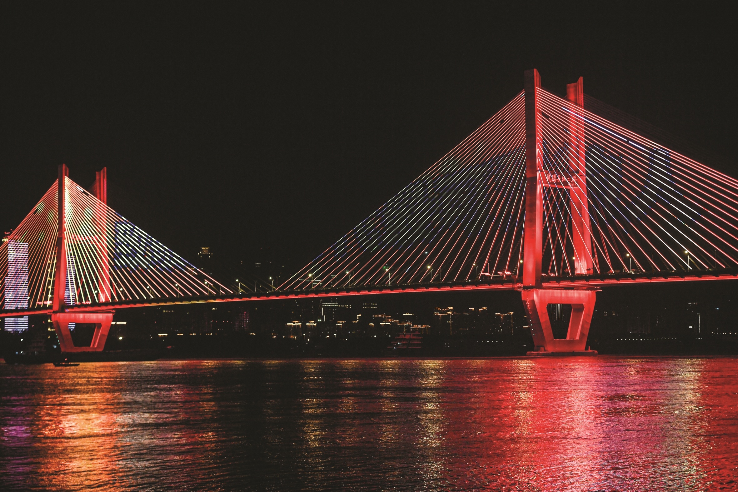 8月17日晚,武汉长江二桥上显示致敬医务工作者主题灯光秀。为迎接8月19日第四个“中国医师节”,8月17日起至22日,每天19:30至22:30 ,湖北省卫生健康委联合武汉市城市管理执法委员会,点亮武汉两江四岸楼宇,向荆楚医务工作者致敬。楚天都市报极目新闻记者 王永胜 摄影报道