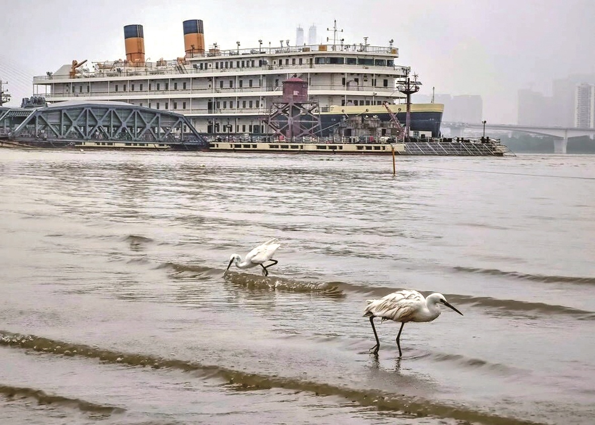昨日上午,在汉口江滩公园三阳路段,被江水淹没的最低一层亲水平台上,几只白鹭结伴觅食、嬉戏,引来众多游客围观。他们说,汉口江滩建成近20年来,这是他们第一次在这里看到白鹭停留。随着环保理念越来越深入人心,人们与野生动物们的相处也越来越和谐。
