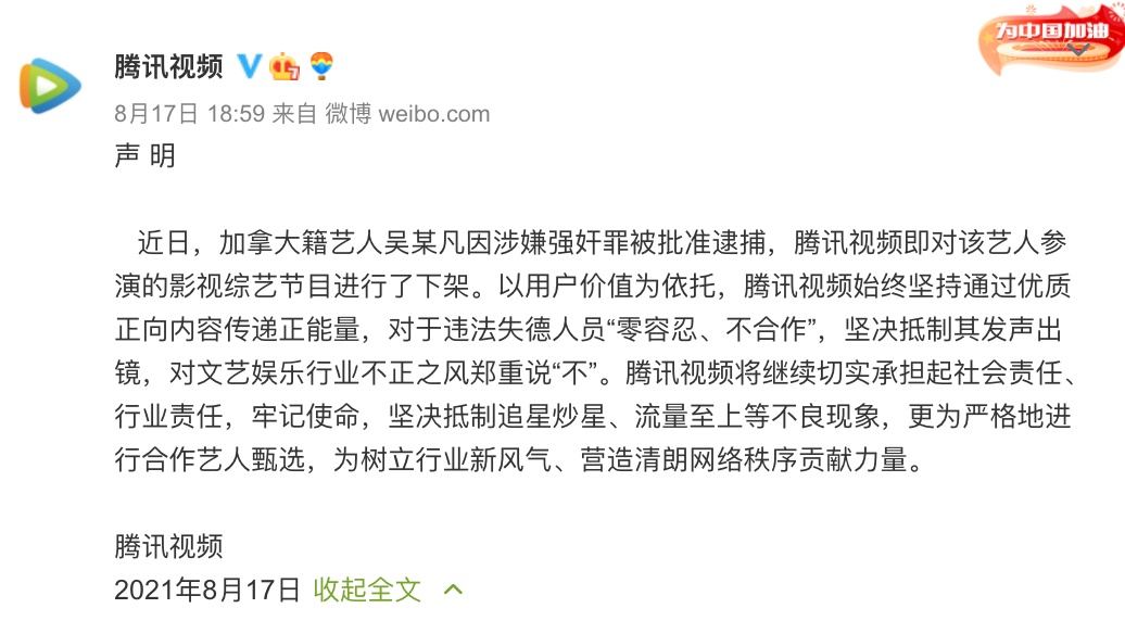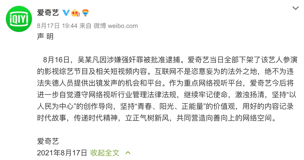 中国青年报(ID:zqbcyol)注意到,8月17日晚,多家视频平台发声明表示,已下架吴亦凡的影视综艺节目。