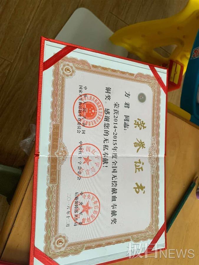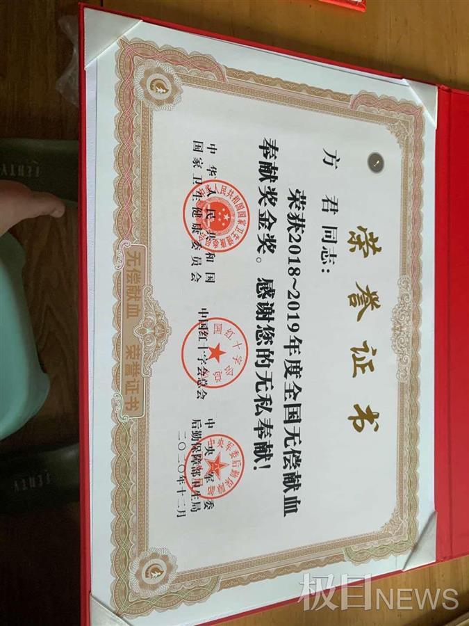 19年来至今,方君已无偿献血89次。按成分献血1个治疗剂量折合成200毫升全血计算,方君19年来共计无偿献血34800毫升。他曾荣获全国无偿献血奉献奖金奖、铜奖。即使在去年武汉疫情期间,他也未停止献血,还因此荣获由武汉血液中心和深圳市之缘公益基金会共同颁发的武汉战役纪念章。
