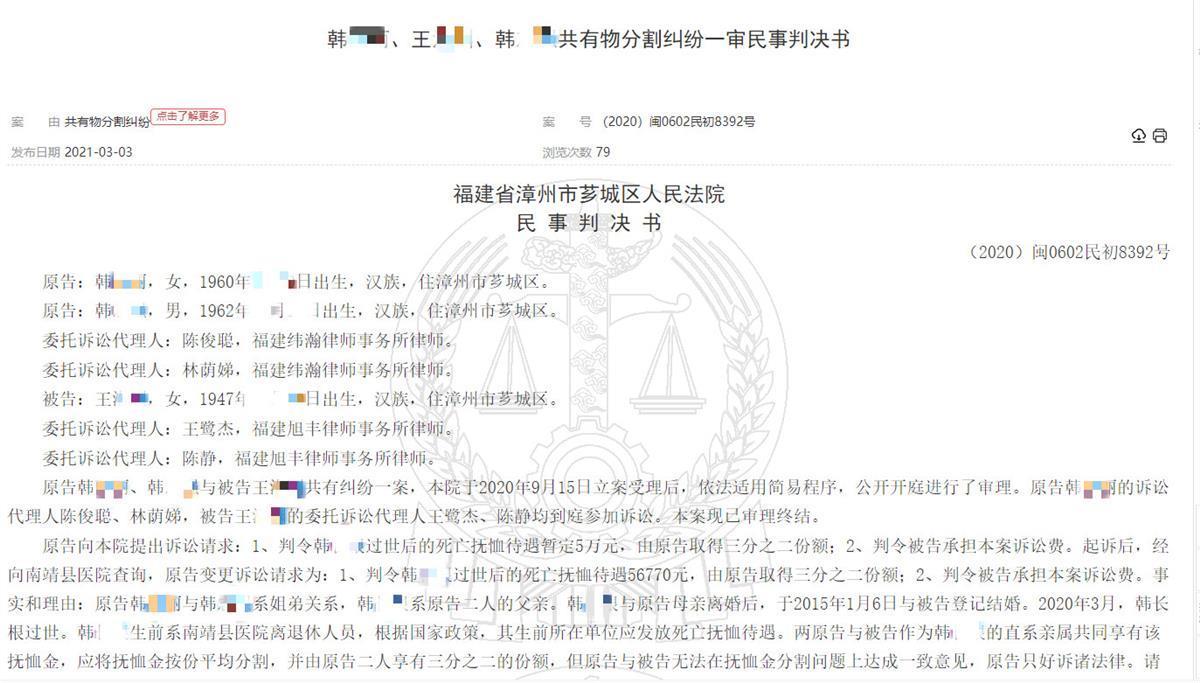 2020年10月29日,漳州市芗城区人民法院做出一审判决,鉴于方淼与林善光婚后共同生活多年,双方之间存在相互扶助义务,现方淼已年逾古稀,并已失去劳动能力,在分配抚恤金时方面淼应相较于其他近亲属适当多分。因此本院酌情认定方淼应分得70%为宜,即45780元×70%=32046元;林通、林茵二人各分得6867元。