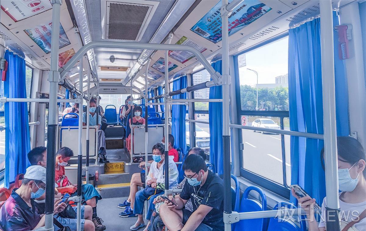 8月18日,记者探访411、536、702、502等武汉三镇多趟公交车,发现公交车到站,新乘客上车时,都戴着口罩,上车向司机出示健康码,司机查验乘客健康码、测量乘客体温。