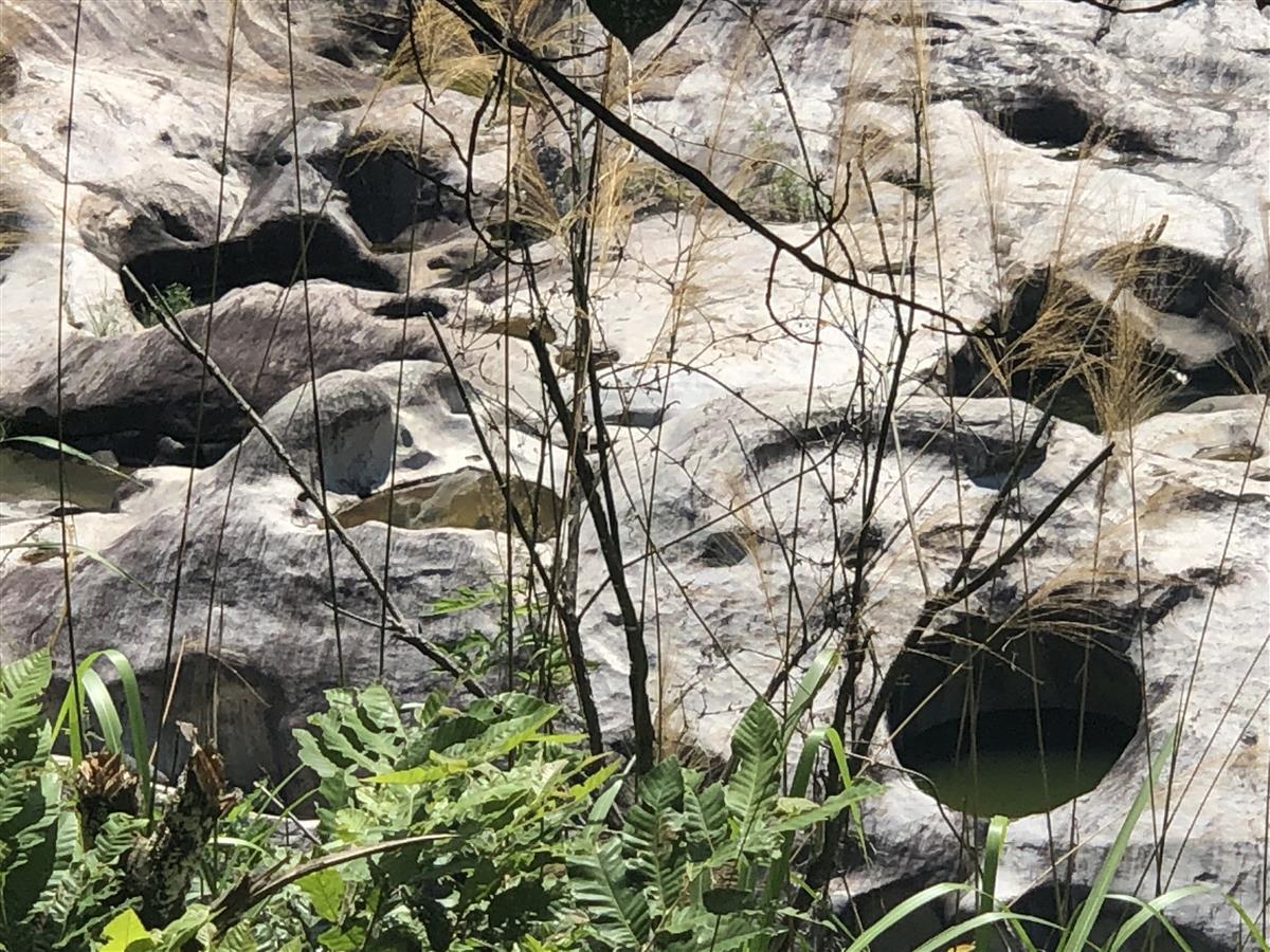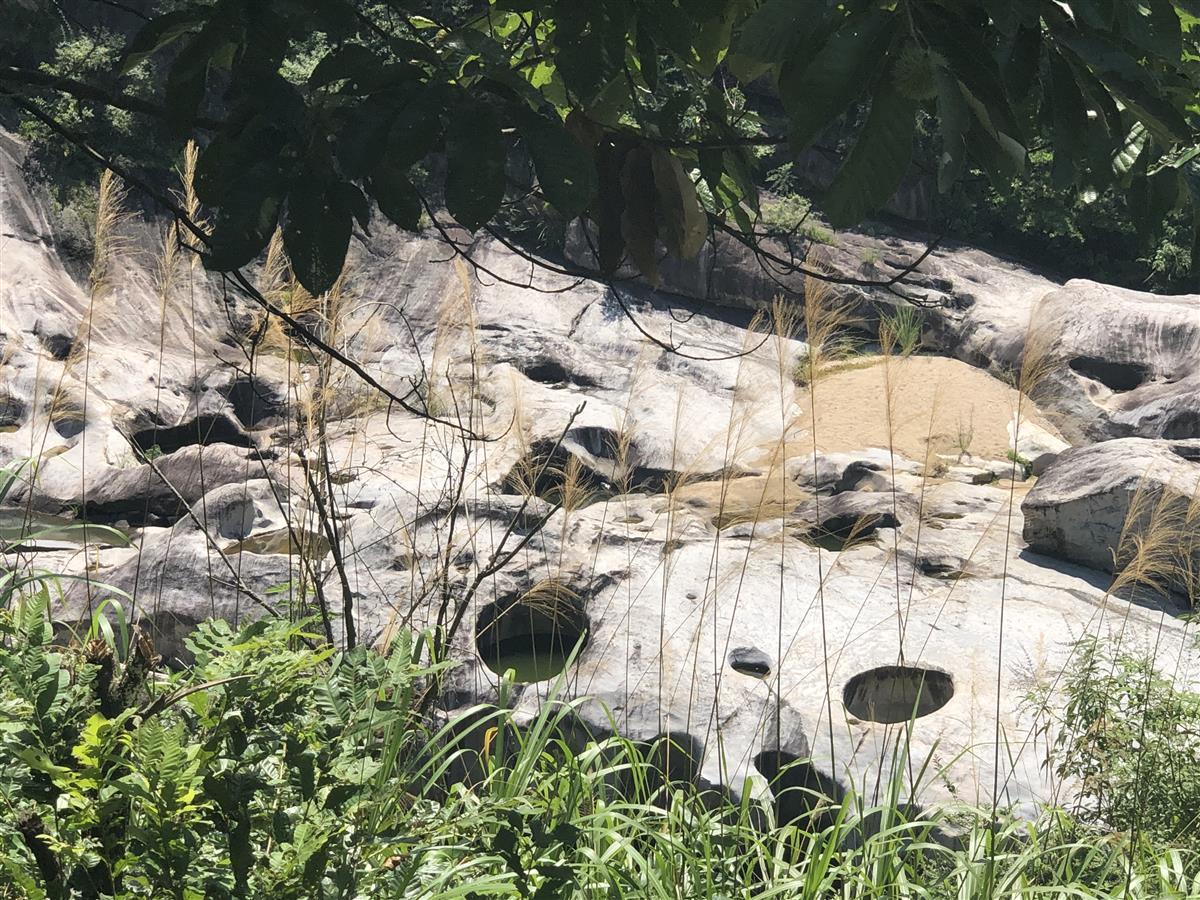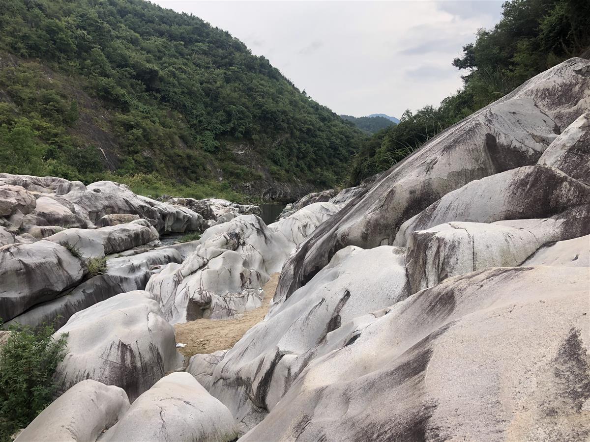 峡谷中的这片石臼,掩映在群山之间,隐藏在绿树深处,宛如一座灰白色的石雕馆。