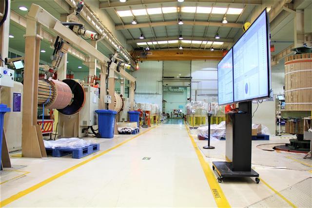 在15000平米的厂房里,与周遭动辄数十吨的变压器器身比起来,入口处两块65吋大小的电子屏并不起眼。