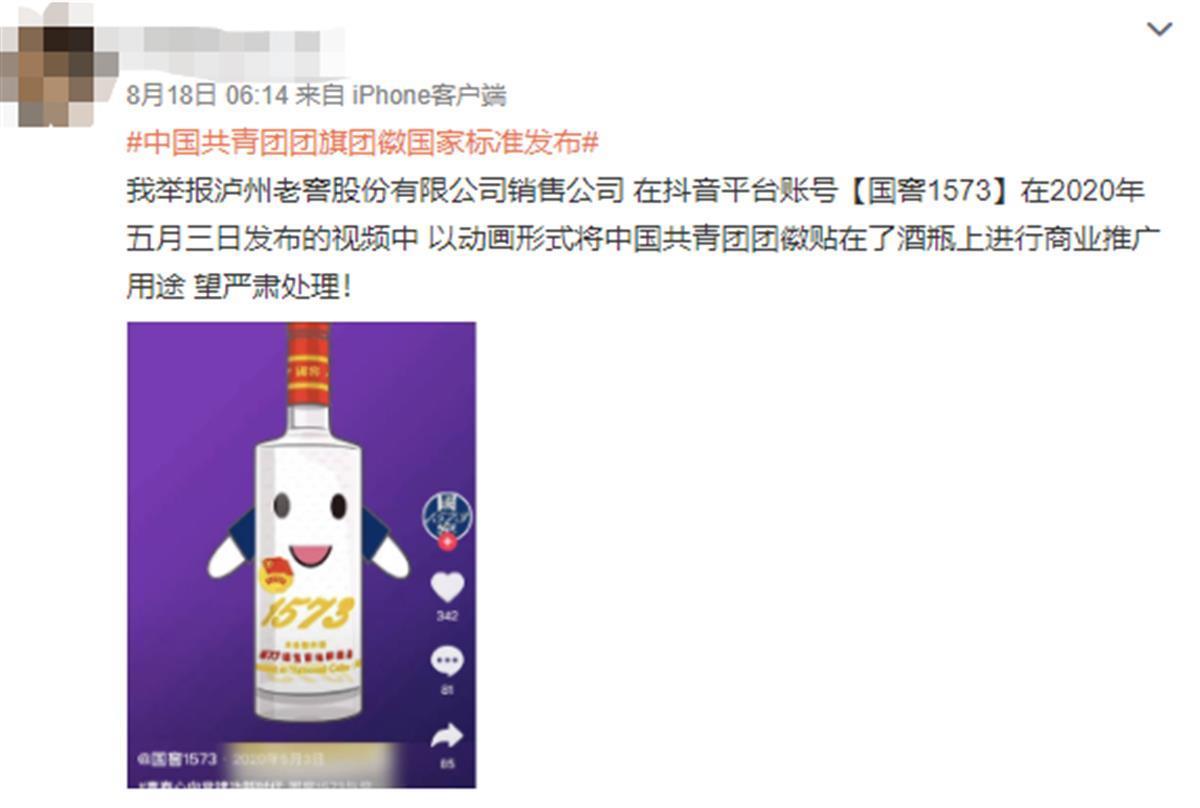 8月18日,有微博网友举报称,泸州老窖国窖酒类销售股份有限公司的短视频账号“国窖1573”,于2020年5月3日发布的视频中,以动画形式将共青团团徽贴在酒瓶上进行商业推广。8月19日,泸州团市委工作人员告诉极目新闻记者,经和企业联系,相关视频已被删除,涉事人员被严肃批评和教育。