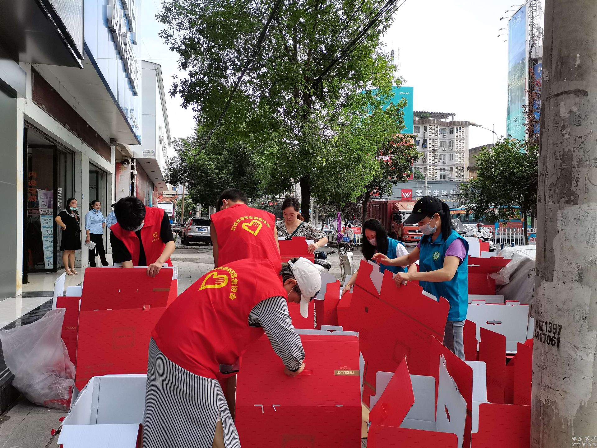 荆楚网(湖北日报网)讯(通讯员程国辉、何博)8月17日早上8点,应城市青年志愿者协会组织志愿者,帮助爱心企业打包30床棉被装车送往襄阳市南漳县。