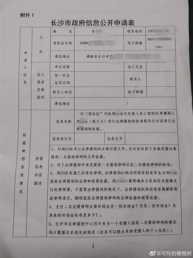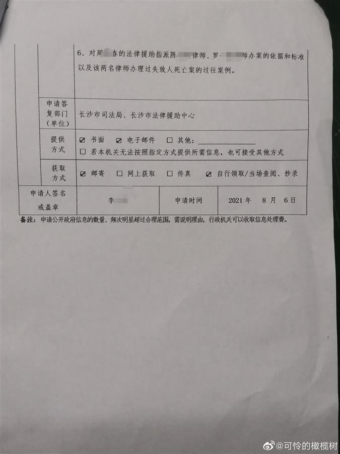 8月13日,李女士发微博称,她于当日来到岳麓区人民法院提交关于拒绝法援律师的报告,立案大厅下午不对外办公,材料已交给刑事审判庭内勤人员手中。