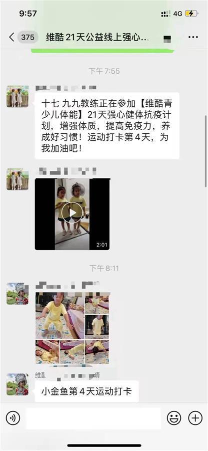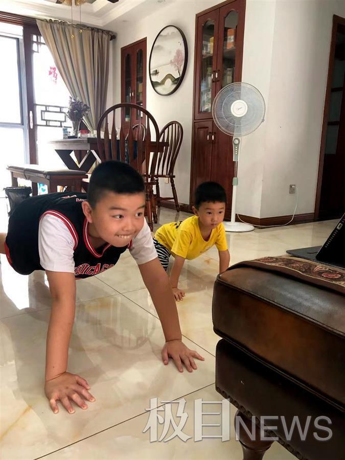 “现在不方便出门,他们在家经常玩手机、看电视,再不多运动一下,到上学时都成胖墩了。一听说有这个活动,我就给大宝和小宝报了名。”杨甜是位二孩妈妈,她为孩子们报了体能训练课程。她4岁半的小儿子、12岁的大儿子非常喜欢这个活动,兄弟俩每天上课特别积极,开课以来没有一天缺勤。