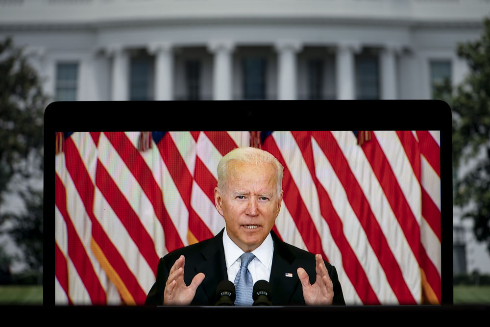 8月16日拍摄的电子屏幕显示,美国总统拜登在华盛顿白宫就阿富汗局势发表讲话。(新华社记者刘杰摄)