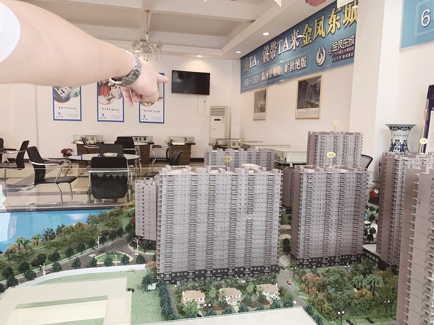 8月16日,记者陪同购房者来到金凤东城营销中心。墙上张贴着项目一期的相关证件,不过没有二期、三期的五证。前台有四名销售人员,楼盘已经建好。