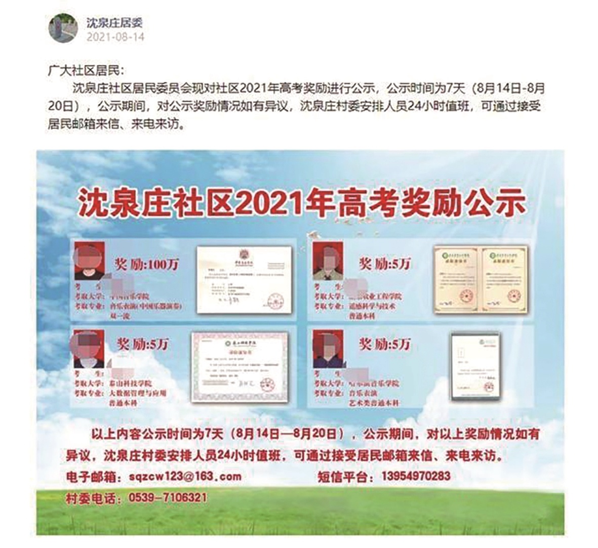 8月14日,山东省临沂市沈泉庄社区在其官方微信公众号发布了一则高考奖励公示信息。公示显示,沈泉庄社区拟对四名考上大学的学生进行奖励,其中3人拟奖励5万元,另一名考上中国音乐学院的学生拟奖励100万元。同时,沈泉庄社区表示,公示期间,对公示奖励情况如有异议,沈泉庄村委安排人员24小时值班,可接受居民邮箱来信、来电来访。