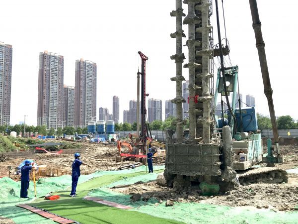 在开工现场,一辆三轴搅拌桩正在进行基坑土体加固,测量人员在测量基坑标高。长江日报见习记者丁傲岸 摄