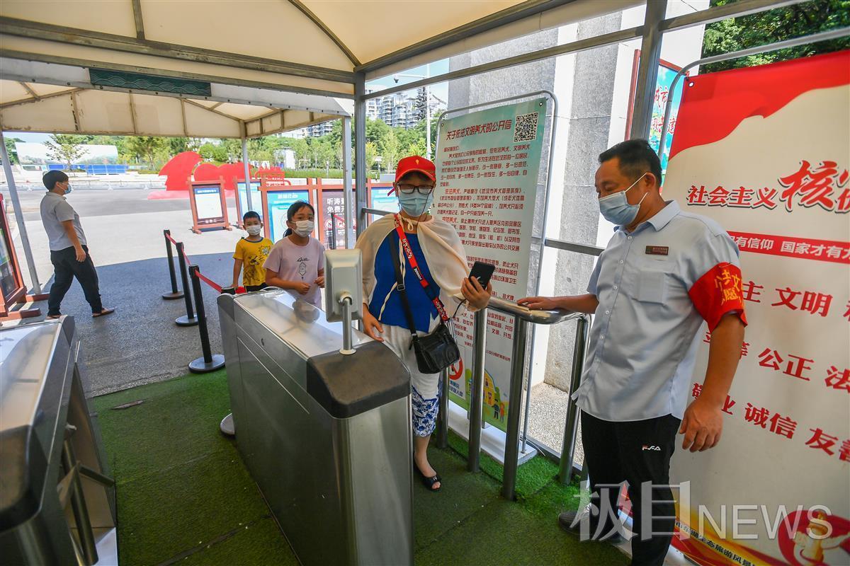 东湖梨园大门,游客自觉佩戴口罩验码依次测温进园。