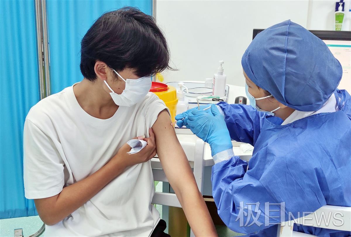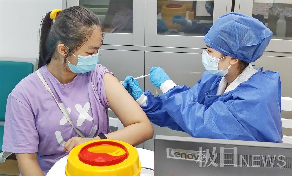 医务人员在为武汉市第十九高中符合接种条件的15至17岁学生接种新冠疫苗