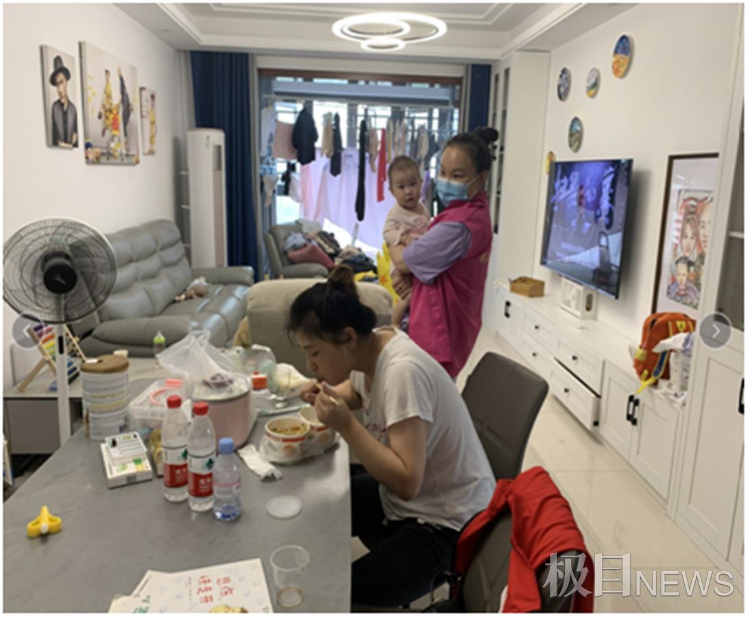 就这样,每天中午11点半,董金萍就前往社区的厨房给张丽荣打好盒饭,骑着电瓶车送到张丽荣的家里去。到了张丽荣家里,在给自己做好消毒处理后,董金萍她们就帮张丽荣带宝宝,让张丽荣能腾出手来安心吃饭。