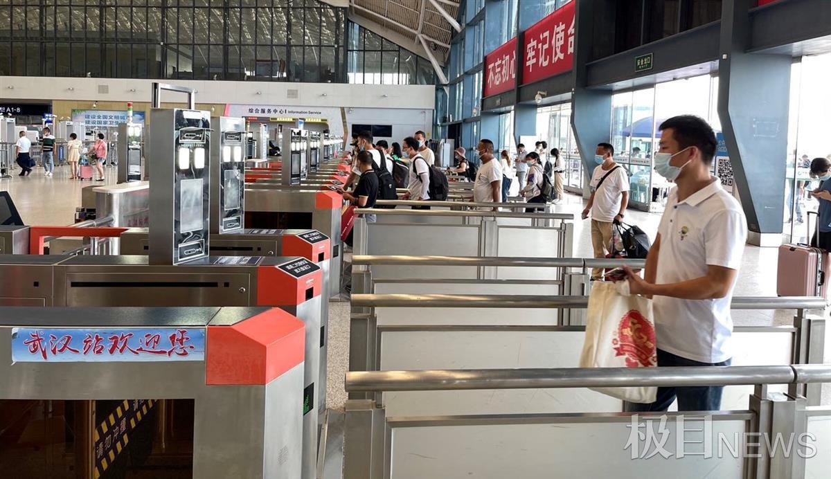 8月20日,极目新闻记者走访武汉三大火车站看到,在车站广播宣传引导下,车站进出站口秩序井然,旅客们纷纷配合工作人员完成测体温、扫码核验通行等各项疫情防控时期进出站必检项目。