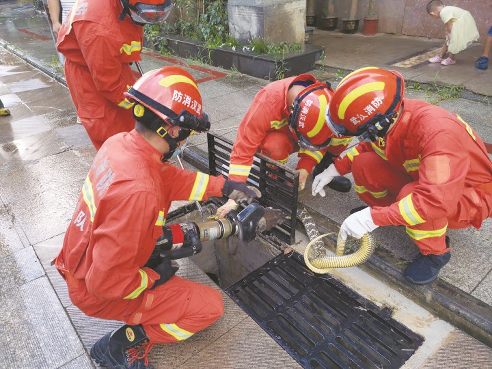为防止对小区居民造成伤害,消防员立即开始处置行动。由两名消防员在做好防护措施后,抓住大蛇尾巴试着慢慢把它拽出来,但由于大蛇体型过大被下水道井盖格栅卡得死死的,压根就拽不动。