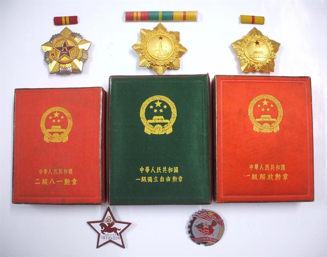 1955年颁发的二级八一勋章、一级独立自由勋章、一级解放勋章和红军十周年纪念章