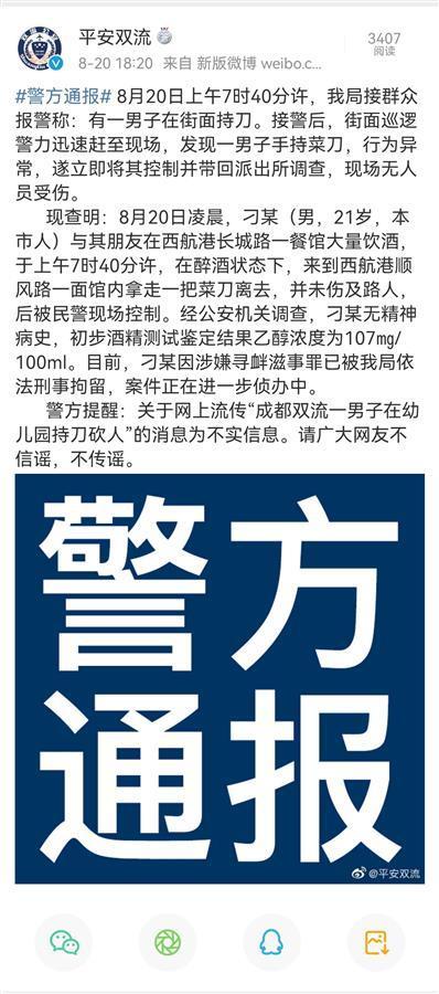 8月20日上午,一张微信群聊天截图流传网络。截图显示,在四川成都双流区某幼儿园的家长群中,有家长称在幼儿园门口,有人持菜刀砍人,叮嘱老师看好孩子。成都市公安局双流区分局发布通报称,有一醉酒男子在街面持刀,未伤及路人。极目新闻记者注意到,事发地点离幼儿园有3公里距离。