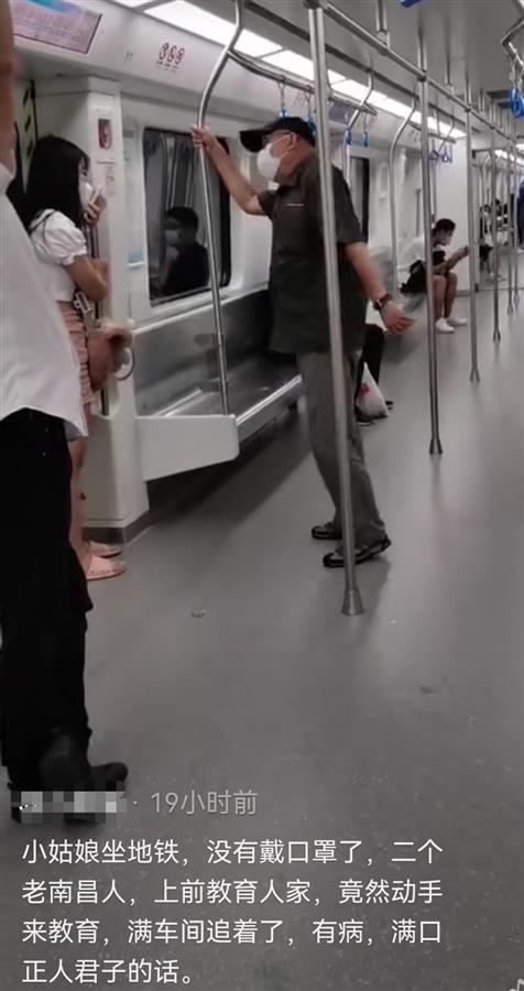在社交平台上,一用户发布了这两则视频,并配文称:“小姑娘坐地铁,没有戴口罩,二个老南昌人,上去教育人家,满车间追着跑。”“穷追不舍,吓着人家在那里哭了。”该用户还在评论区里回复网友称“喝酒了,满口正人君子的话”,并称该女子已报警。