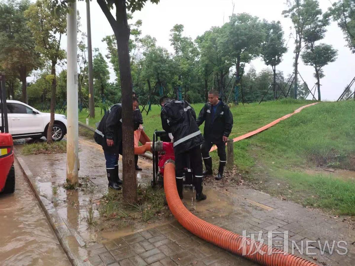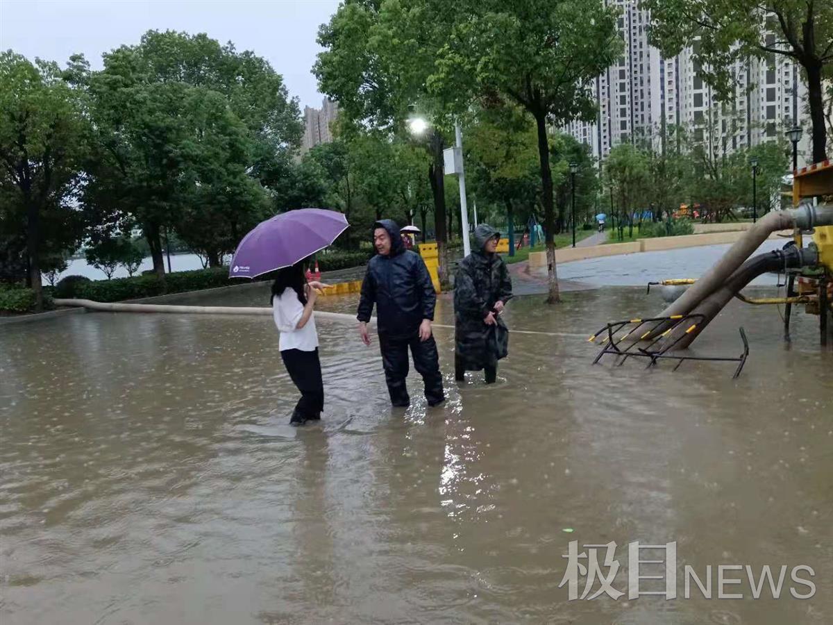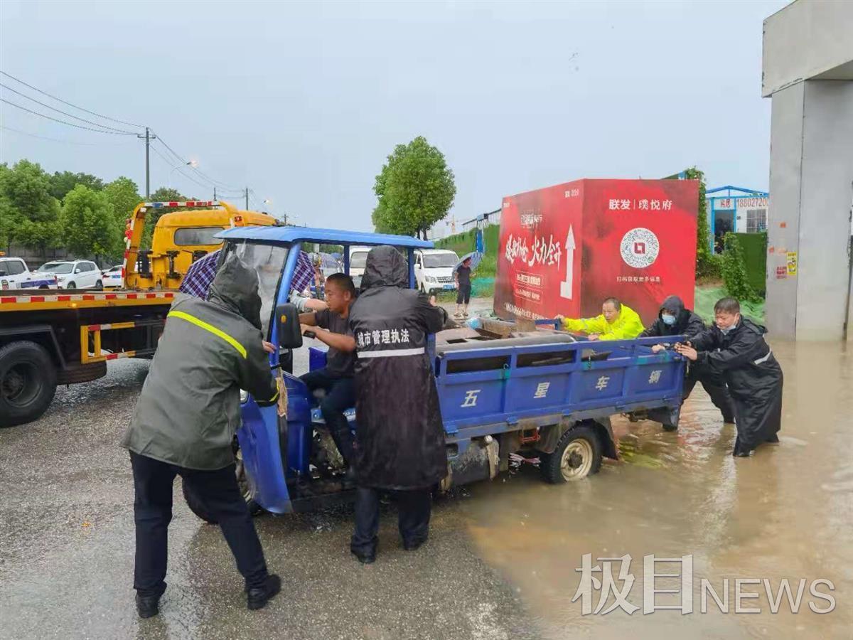受短时强降雨影响,径河街滨河南路出现积水,径河街城管所所长李刚、执法队长徐伟山等人第一时间赶赴现场,调集抽水龙,抽排积水。位于滨河南路路口处的东原印未来项目工地门口,积水最深时达40公分,“一二三,一二三,一二三,加把劲……”1个小时不到的时间里,有3辆车驶出工地时熄火。李刚、徐伟山帮忙推车,附近赶来的城管队员、环卫保洁员工纷纷加入推车行列,3辆车均安全驶出积水处。